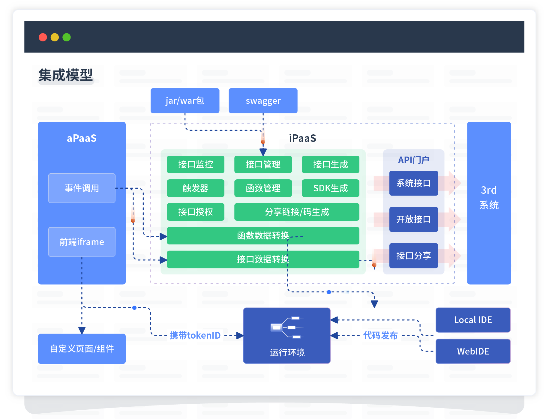 集成模型包括平台本身前、、、、、、后端能力的扩展,,,,,,,,,也支持通过API门户和第三方系统进行交互。。。。。。。。
