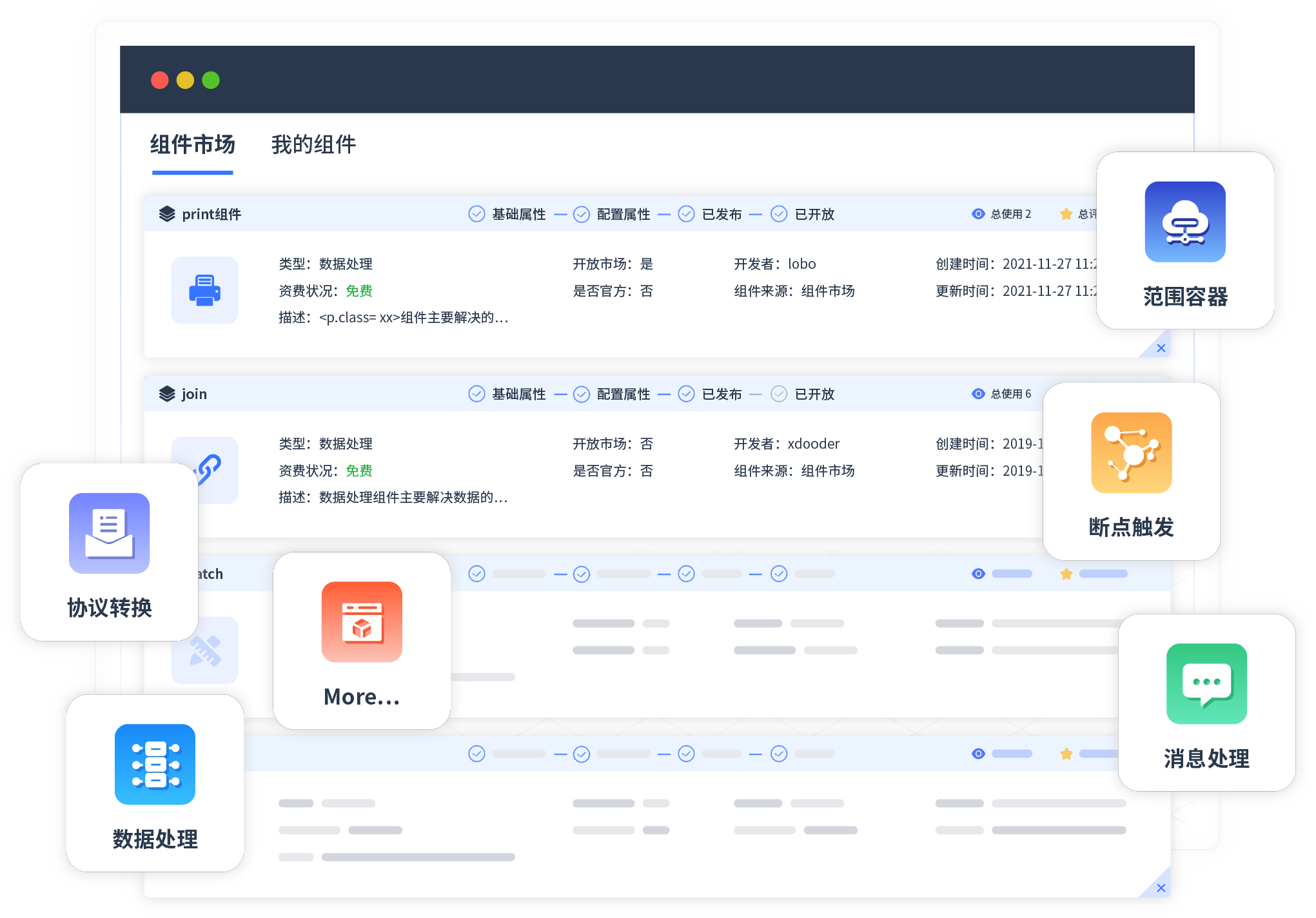 针对集成场景,,,,,,,,,,,,,,,小微钱包提供组件市场,,,,,,,例如协议转换、、、、、消息处理、、、、、、、、、文件操作等。。。。。。。除平台提供的组件外,,,,,,客户可以自定义所需组件。。。。。。。