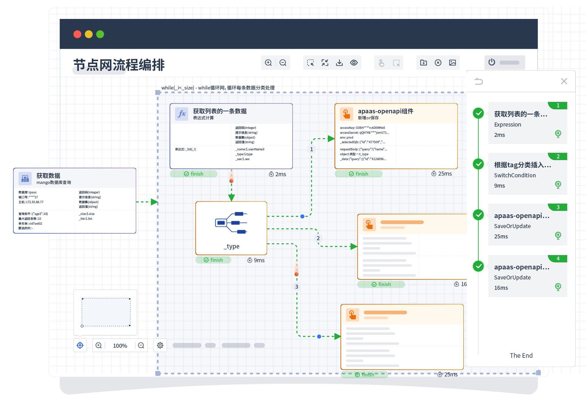 针对集成场景,,,,,,,,,组件定义后支持进行流程编制,,,,,,,,不同于传统代码方式,,,,,,,,,,,,通过图形化展示,,,,,,,,,,,,支持在线调试、、、、、、、、、日志查看和运行回放。。。。。。。。。。。。。